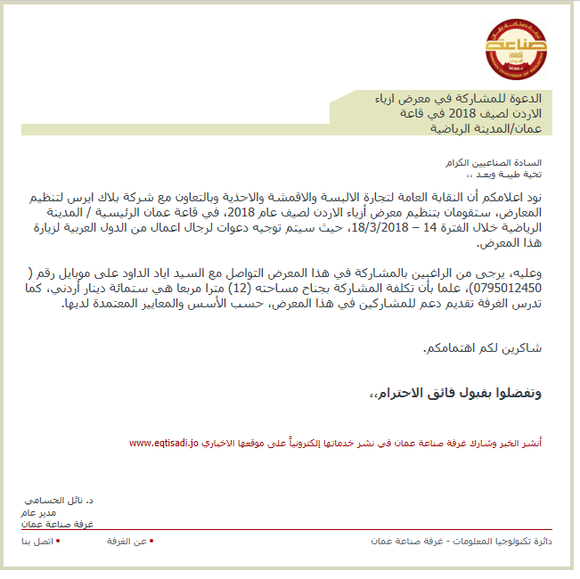 نود اعلامكم أن النقابة العامة لتجارة الالبسة والاقمشة والاحذية وبالتعاون مع شركة بلاك ايرس لتنظيم المعارض، ستقومان بتنظيم معرض أزياء الاردن لصيف عام 2018، في قاعة عمان الرئيسية / المدينة الرياضية خلال الفترة 14 – 18/3/2018، حيث سيتم توجيه دعوات لرجال اعمال من الدول العربية لزيارة هذا المعرض.