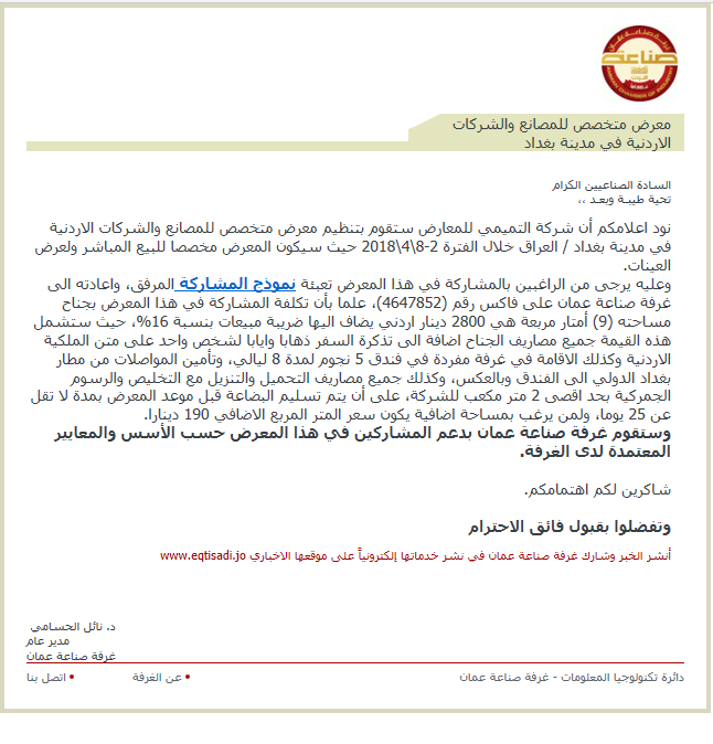 نود اعلامكم أن شركة التميمي للمعارض ستقوم بتنظيم معرض متخصص للمصانع والشركات الاردنية في مدينة بغداد / العراق خلال الفترة 2-8\4\2018 حيث سيكون المعرض مخصصا للبيع المباشر ولعرض العينات.