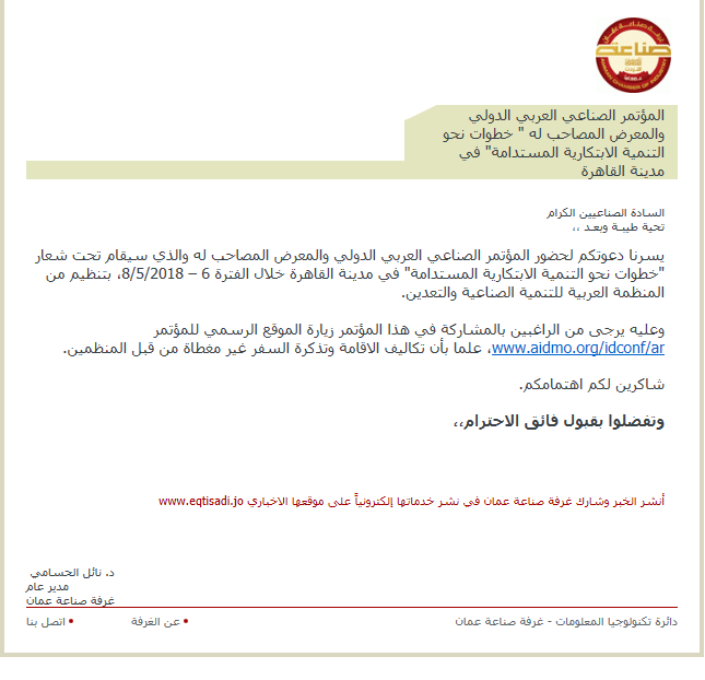 يسرنا دعوتكم لحضور المؤتمر الصناعي العربي الدولي والمعرض المصاحب له والذي سيقام تحت شعار "خطوات نحو التنمية الابتكارية المستدامة" في مدينة القاهرة خلال الفترة 6 – 8/5/2018، بتنظيم من المنظمة العربية للتنمية الصناعية والتعدين.